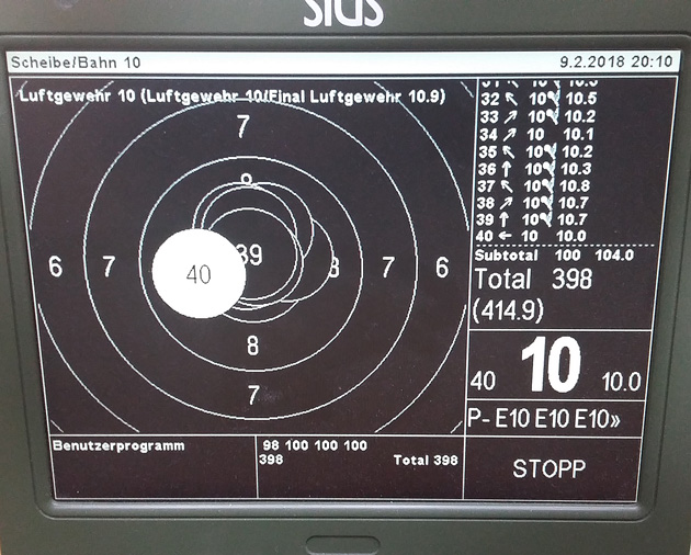 Auf Postion 1 wetteiferten Jürg Ebnöther und Lisa Suremann um den Siegpunkt. Der amtierende Armbrust-Europameister hatte eine gute Kadenz und startete mit 99/99/98. Lisa musste bereits in der Startpasse zwei Neuner in kauf nehmen was sie offensichtlich etwas irritierte. Sie biss dann auf die Zähne und reihte Zehner um Zehner an ein ander, total 32 Stück, bis zum grossartigen Matchende von 398 Punkten. Dies brachte den guten Jürg offensichtlich etwas aus dem Konzept was die schwache Schlusspasse von 94 erklären mag. Doch 390 Punkte mit einer 94er Passe ist ja nicht nichts!
