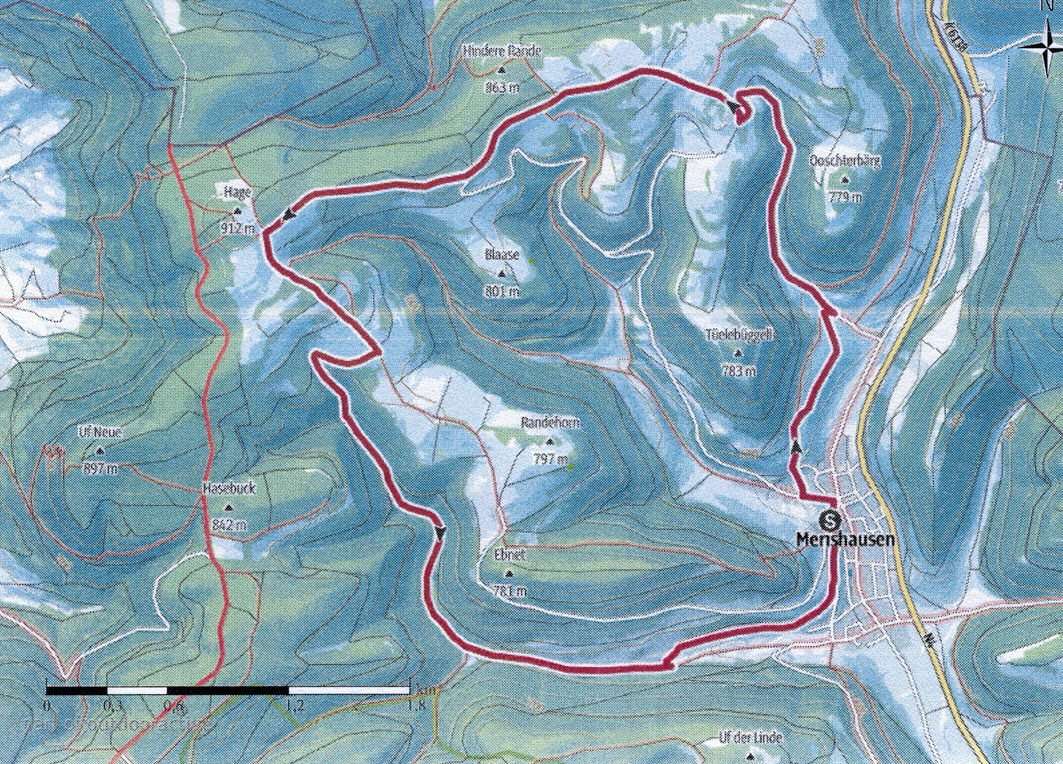Deshalb waren Edwin, Kurt und ich heute unterwegs um eine Vereinswanderung zu rekognoszieren. Kurt hatte einen Vorschlag der uns begeisterte. Leider war das Wetter nicht gerade begeisternd, es wehte eine steiffe Biese und die Sonne zeigte sich erst nach dem Mittagessen und zwar recht zögerlich. Da die Beizen - vermutlich auf Grund eines Feiertages geschlossen waren - verpflegten wir uns aus dem Rucksack. Auf der Karte sieht es von oben betrachtet und wenn man die Höhenkurven ignoriert so aus wie der Lauf um den Pfäffikersee. Dem war aber nicht ganz so, vor allem am Anfang ging es noch ganz ordentlich opsi. Kurz vor 12 Uhr trafen wir beim Hagenturm, dem höchsten Punkt in Kt. Schaffhausen ein. Der Stahlturm ist etwa 40 Meter hoch und man hätte eine traumhafte Aussicht bis weit nach Deutschland, dann natürlich weite Teile der Schweiz, ja bis nach Österreich - behauptet Kurt! Leider war es sehr dunstig und vor allem windig, dass man die Mütze mit beiden Händen halten musste. Die restliche Wanderung konnten wir dann aber nach dem Vesper geniessen, die Sonne wärmte unsere steifen Glieder und bei der Täuferquelle hätten wir, so Durst vorhanden gewesen wäre, diesen mit dem glasklaren Quellwasser löschen können.