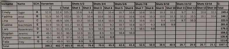 Im Final konnte Fadrina - die in den Einzelschüssen alles Zehner erzielte - ihren zweiten Platz problemlos verteidigen während Lars noch einen Rang einbüsste. Im Zürcher Kantonalkader fehlten etliche die am Shootingmasters im Einsatz waren, wie beispielsweise Polina.